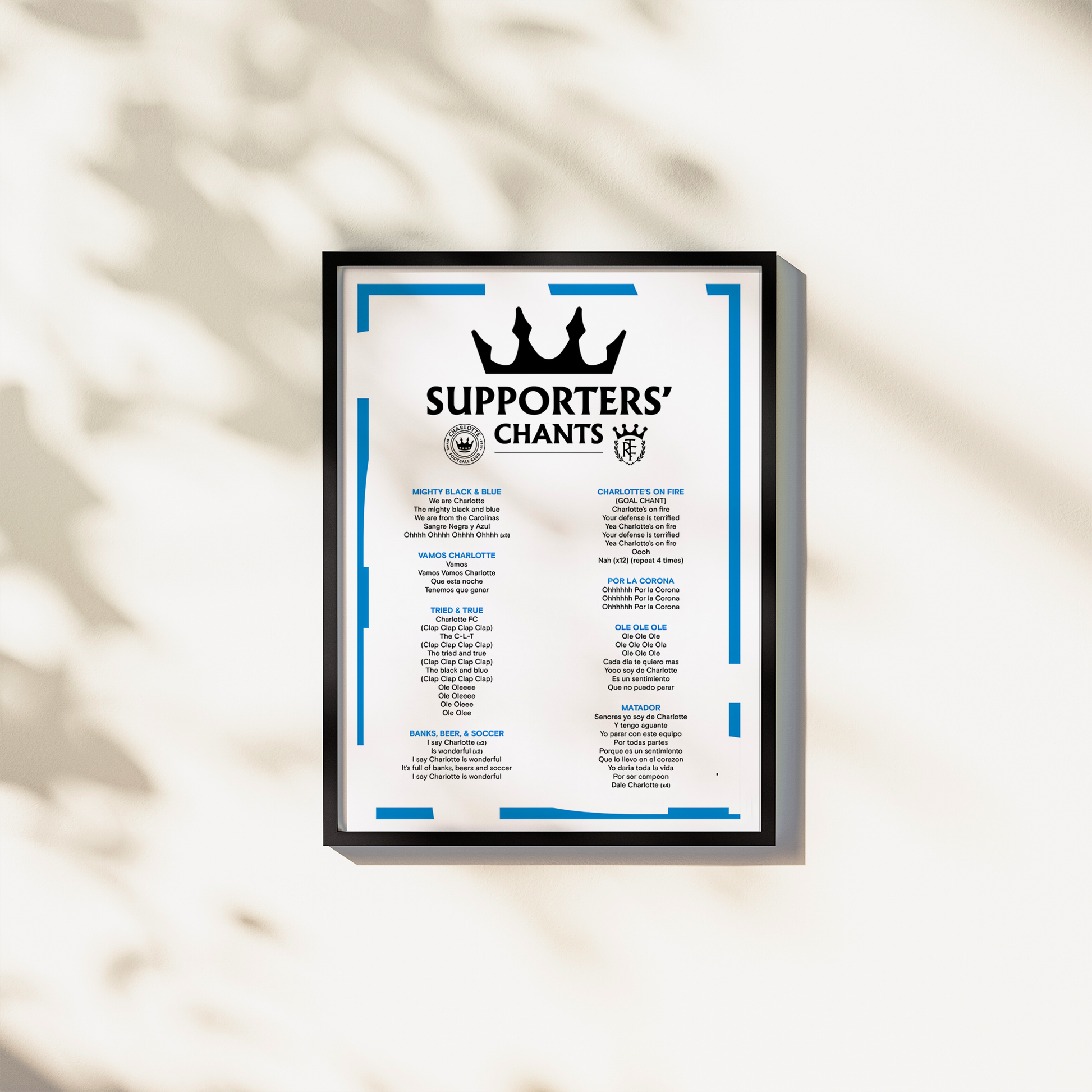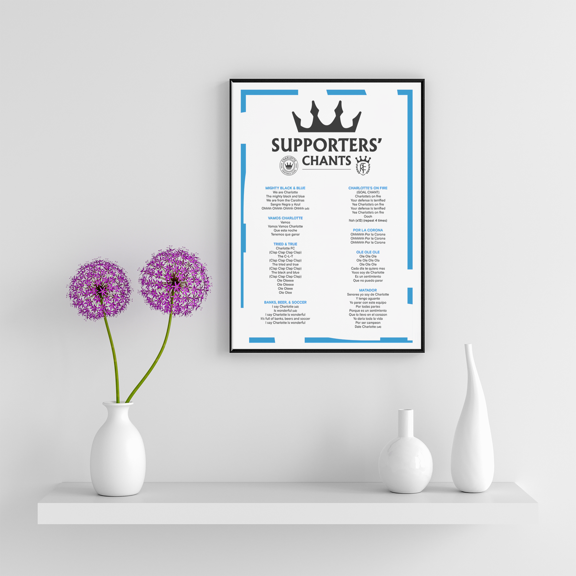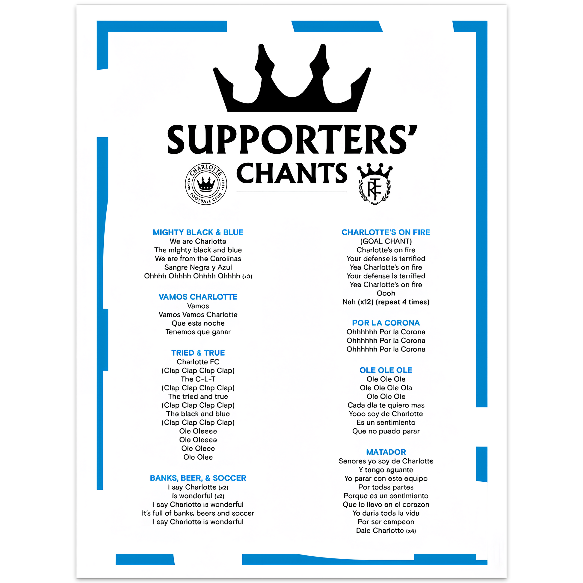 Get ready to elevate your game-day experience with the Charlotte FC Supporter Chants poster! Perfect for any dedicated fan, this vibrant poster features a collection of the most iconic and spirited chants that fill the stadium with energy and unity. From the mighty "Black & Blue" anthem to the fiery "Charlotte's On Fire" goal chant, this poster captures the essence of the Charlotte FC fan culture.